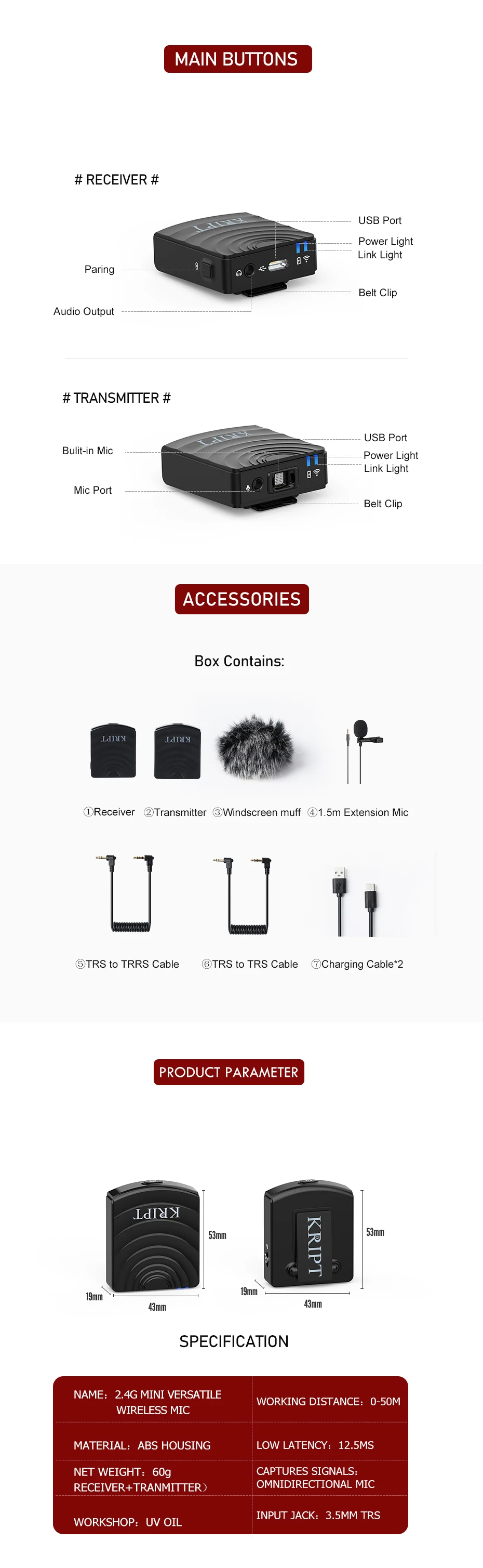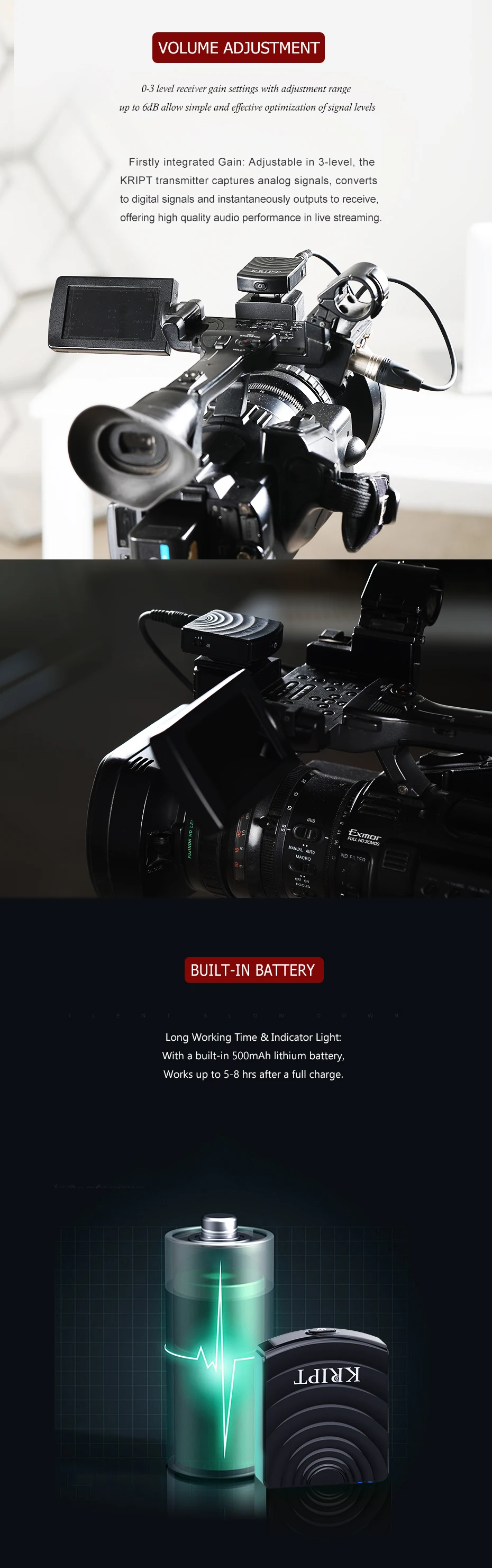 • Long Working Time & Indicator Light: With a built-in 500mAh lithium battery, works up to 5 hours after a full charge. It supports charging-while-recording. Power and pairing indicator lights on TX and RX inform working status like power, charging, pairing and low cut function.