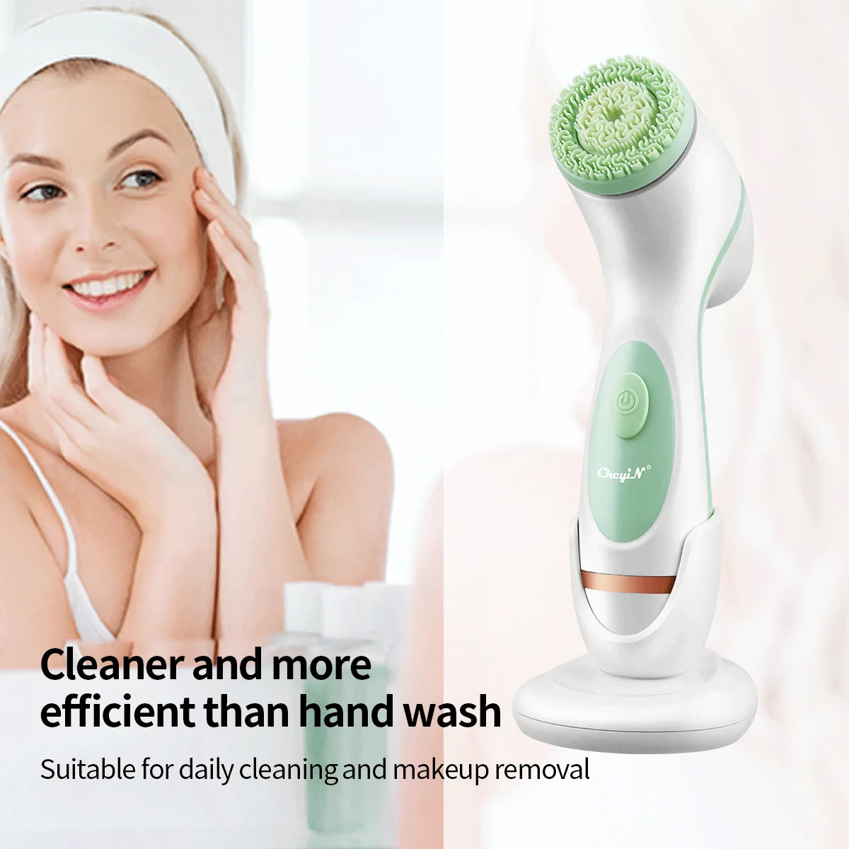 [3 In 1 Design] Come with 3 replaceable cleaning heads, 2 skin-friendly silicone bristle brush head for both face massage and cleaning, 1 Dupont soft and fine bristle brush head thoroughly cleans skin pores.