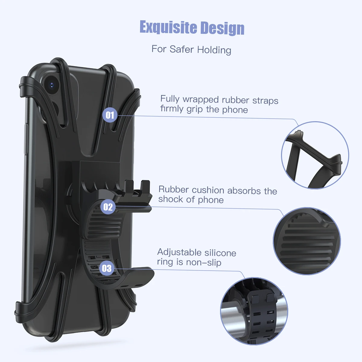 Safe Protection and Shock-absorbing: Different from plastic mount, this flexible silicone can absorb some vibration. This bicycle phone holder can withstand powerful vibrations and shocks. Additional, the soft silicone holder won't cause any damage to your valuable cellphone.
