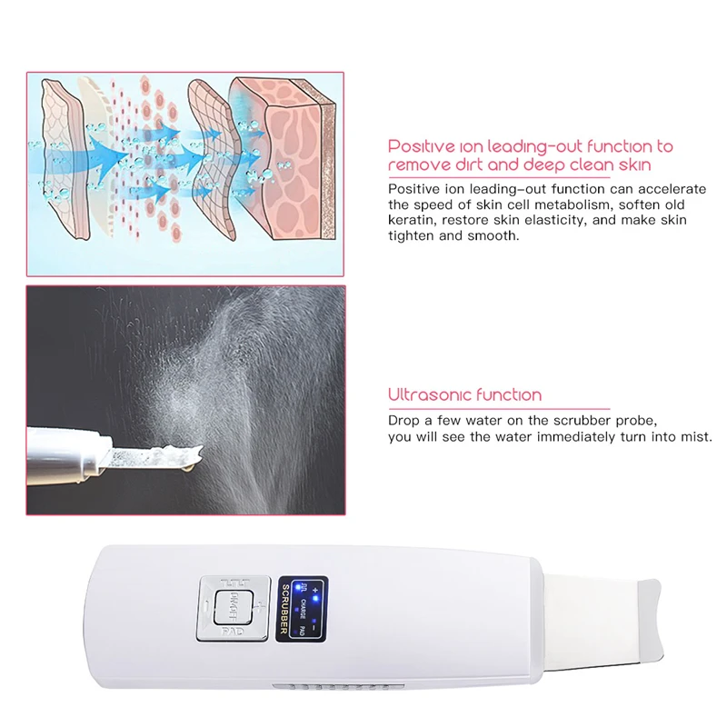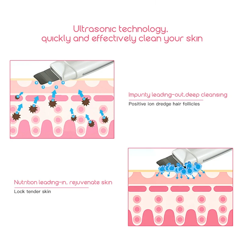 ULTRASONIC DEEP CLEANSING - High frequency ultrasonic oscillation technology is transmitted to the skin’s surface delivering instantaneous pressure and vibration. It’s able to penetrate the skin in 3-5mm, effectively removes blackheads, dead skin and dirt, allowing your skin to regain its clearness and cleanliness.